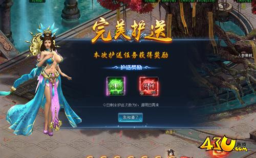 在43u《神仙劫》中每天的为15:30-16:00和18:30-19:00为双倍护送美人时间,小伙伴们每天可以护送美人3次,双倍护送会获得40万经验和60历练!小伙伴们度当前美人品质不满意可以消耗护送令可提升美人品质哦!美人令可商城购买,也可参与日常任务或悬赏任务来获得。