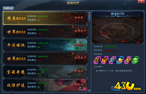 玩游戏,怎么能少的了大BOSS呢?43u《神仙劫》活动大厅中为玩家们准备了很多有趣的玩法,午间瑶池、宝箱奇遇、双倍护送、世界BOSS、精英BOSS等等,今天小编要给大家介绍的就是精英BOSS活动规则,一起看过来吧!