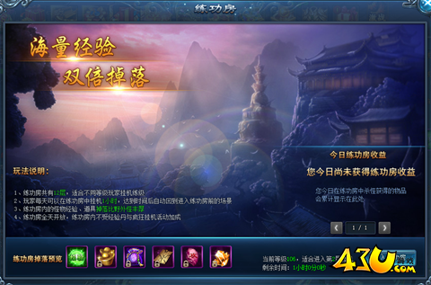 2.玩家每天可以在练功房中挂机1小时,达到时间后自动回到进入练功房前的场景