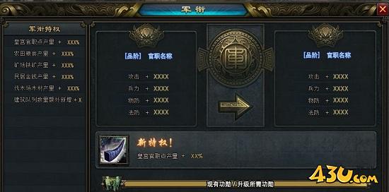 军衔特权是每次提升军衔等级,都会提升您的军衔特权,如:增加皇宫官职点产量,增加农田粮食产量,增加矿场铁矿产量,增加民居金钱产量,增加伐木场木材产量,甚至还有增加建筑队列数量!每一项特权,都能为主公提供到位的资源加成和最贴心的功能。相信每一位主公都懂得:兵马未动,粮草先行。那么军衔系统,绝对是为了战争量身定做的福利!