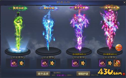 43u《鸿蒙天尊》护送仙剑活动会在每天的15:00和18:30各开一场,玩家有乾清仙剑、乾元仙剑、乾灵仙剑、乾坤仙剑4钟品质可以护送,每种品质的仙剑奖励也是大不同哦!如果对当前的仙剑品质不满意可以消耗护剑令牌来提升仙剑品质,越高品质的仙剑奖励越丰厚!