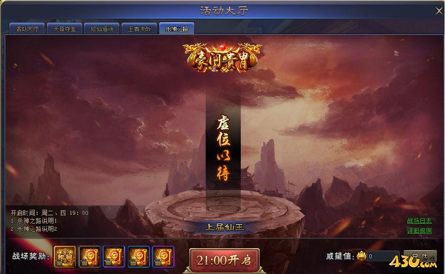 2、战场分为两层:第一层杀神历练,第二层杀神战场;