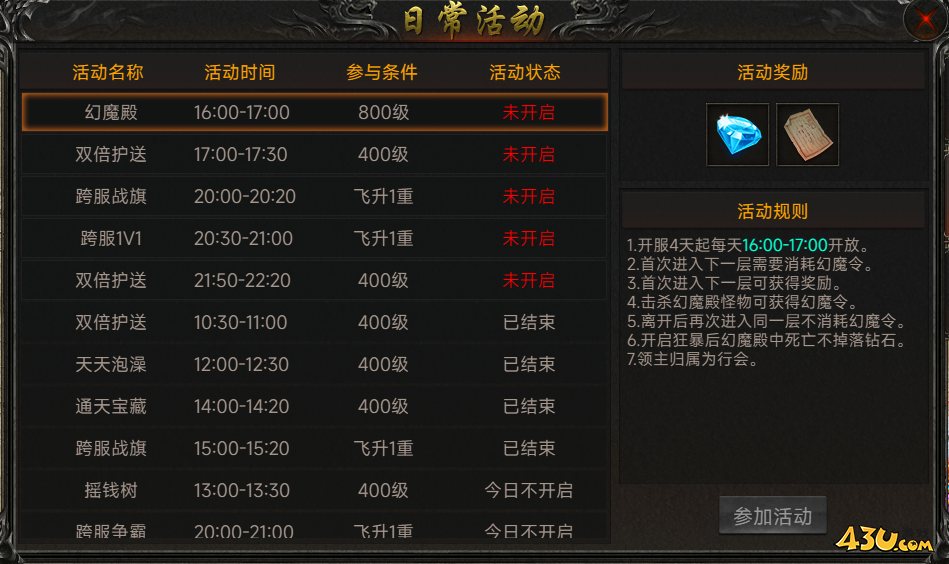 每天有多个日常活动可参加,玩家可在活动时间内并且达到参与条件即可参加活动。