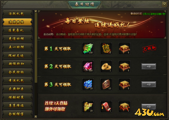 活动说明:活动期间,登陆游戏可领取不同天数的奖励,连续3天登陆可再领取额外奖励