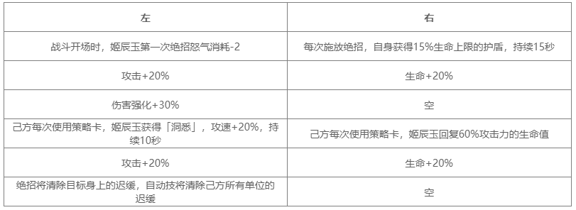 技能描述:姬辰玉在场上时,每当己方使用策略卡,姬辰玉下一次绝招费用-1,最低降为1。